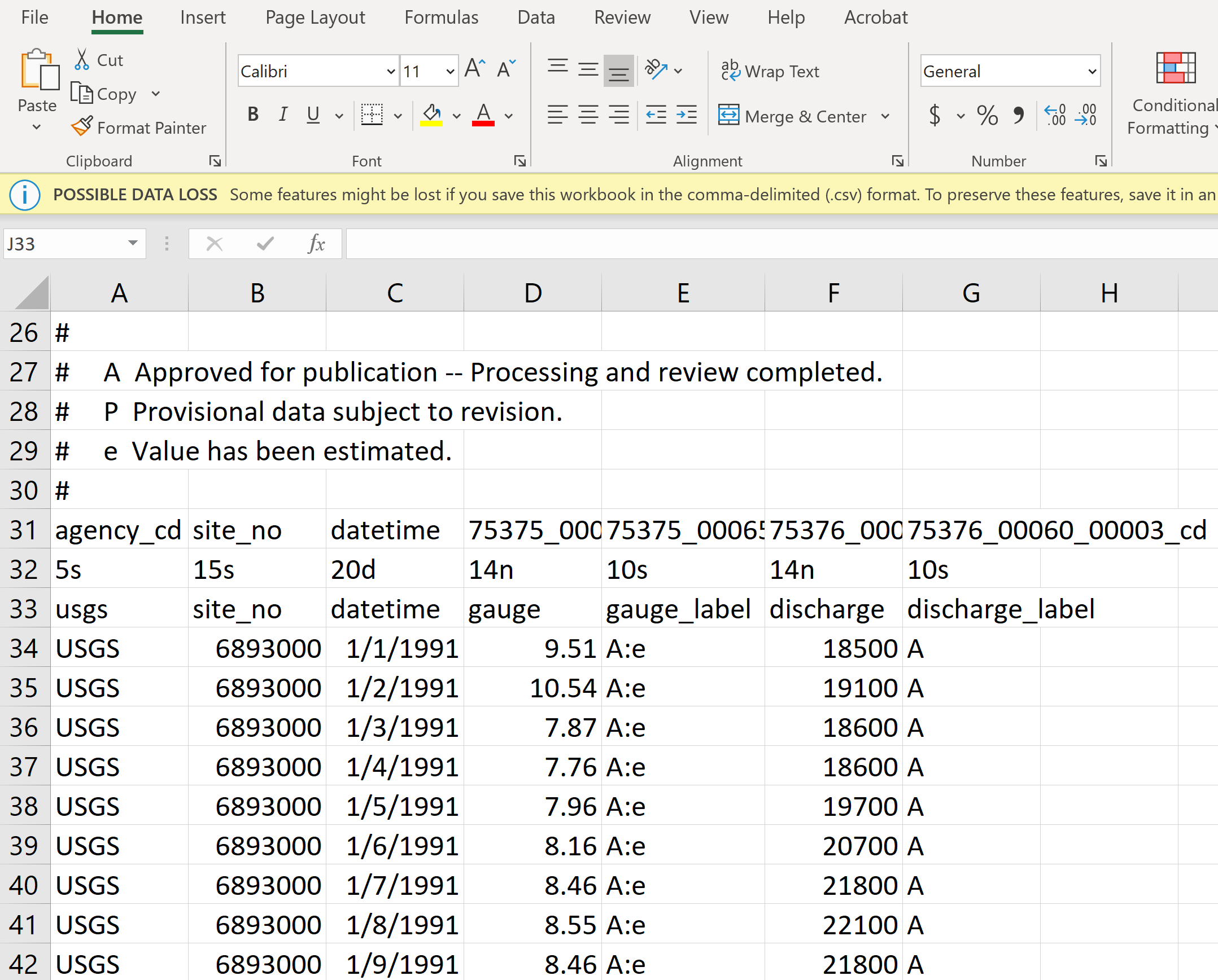 In this lab, we want to study the time series of river discharge in terms of return frequencies, please select a site where at least 10-year data is available. I selected the daily stream flow data in 1991/01/01 - 2020/12/31 at the Kansas City site. Select output format “Tab-separated” and click “Go”, the data will be shown on the web-browser. Copy all the data (you can use ‘Ctl-a’ and ‘Ctl-C’ to do so) and paste them to the MicroSoft Excel, and save the data with the name “usgs06893000\19910101\20201231.csv”). Add the following information to the 33rd row of Excel file (which will be used later in the coding) and save the file again, see below figure.